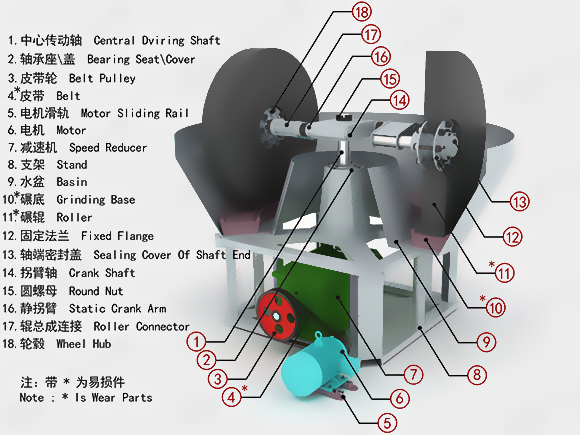 濕碾機采用輪動式磨礦的工作方式:首先電動機將動力傳動至減速機,在減速機帶動下,通過大立軸將力矩傳遞給上方的橫軸,然后經安裝在橫軸兩端的拉桿傳遞至碾輪,使碾輪產生驅動力,沿橫軸水平方向做逆時針旋轉運動;工作時的碾輪既能圍繞濕碾機大立軸公轉,又能圍繞碾輪中心軸進行自轉,碾盤則固定不動。添加的礦石物料,在碾磨機內受到來自碾輪自身重量帶來的擠壓力,碾輪公轉自轉時與碾盤產生的巨大摩擦力,在受到反復的擠壓、揉搓、研磨后,被徹底粉碎。